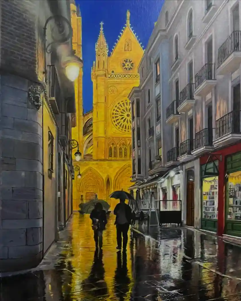 This painting is oil in linen. It is from my experience walking the Camino de Santiago in Spain. This is a five hundred mile pilgrimage across northern Spain to the cathedral at Santiago Spain that has been made for centuries. The scene I painted is a rainy night in Leon Spain. The title of the painting is “Illuminated Grace”.